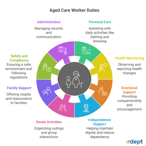 Aged care worker duties include providing personal care, assisting with mobility, supporting daily activities, offering emotional companionship, monitoring wellbeing, ensuring safety, and helping older adults maintain dignity, comfort, and independence in their daily lives.
