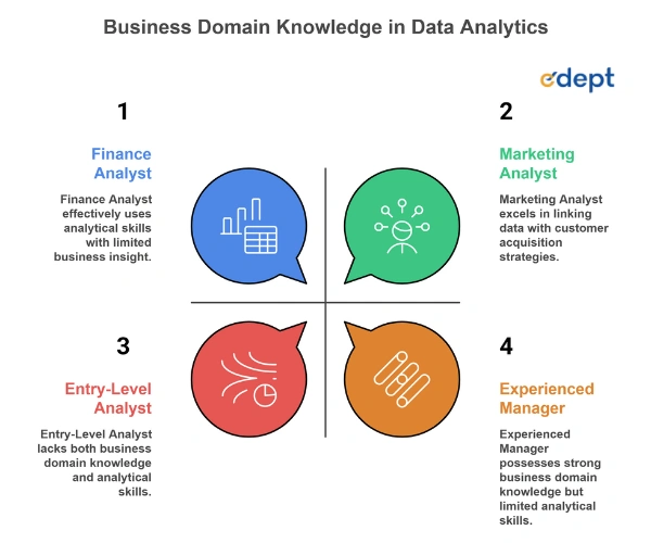 Business domain knowledge in data analytics turns technical work into real business impact. While tools and models are essential, it is business understanding that makes data meaningful. This is also why being in balance enables them to communicate easily with all stakeholders and own their work. This is because technical skills alongside expertise in the industry can lead professionals to facilitate smart decision-making, strong strategies, and success in their careers. Technical skills can be obtained through courses like those offered in edept, which are essential in enabling professionals to deal with the domain-based future. Various courses that encompass domain knowledge along with analytics expertise, including those offered by edept, are essential in preparing professionals for the domain-oriented future that is expected. Therefore, professionals who build domain expertise alongside analytics skills can get faster placements, long-term career security, and higher salaries.
