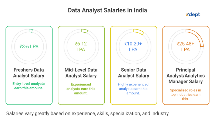 Data Analyst salaries in India vary significantly by experience, skill, and location, with freshers earning ₹3-6 LPA, mid-level analysts ₹6-12 LPA, and senior data analyst salary India is ₹10-20+ LPA, while specialized roles like Principal Analyst or Analytics Manager can reach ₹25-48 LPA or more, especially in top industries like IT, Finance, and E-commerce, with Python, SQL, and Tableau skills being crucial for higher pay.