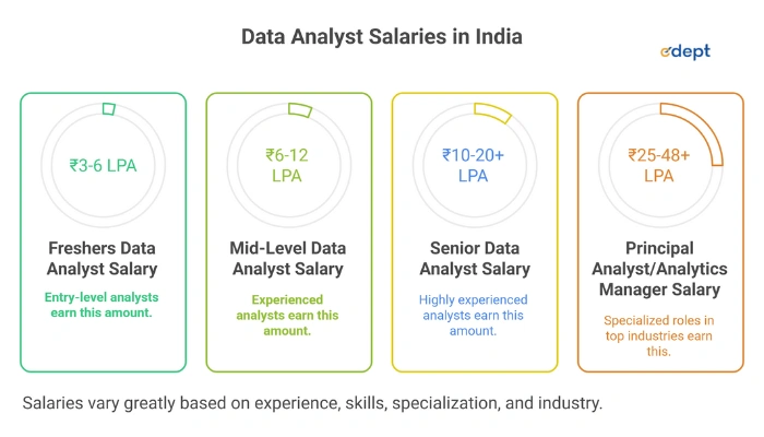 Data Analyst salaries in India vary significantly by experience, skill, and location, with freshers earning ₹3-6 LPA, mid-level analysts ₹6-12 LPA, and senior data analyst salary India is ₹10-20+ LPA, while specialized roles like Principal Analyst or Analytics Manager can reach ₹25-48 LPA or more, especially in top industries like IT, Finance, and E-commerce, with Python, SQL, and Tableau skills being crucial for higher pay.