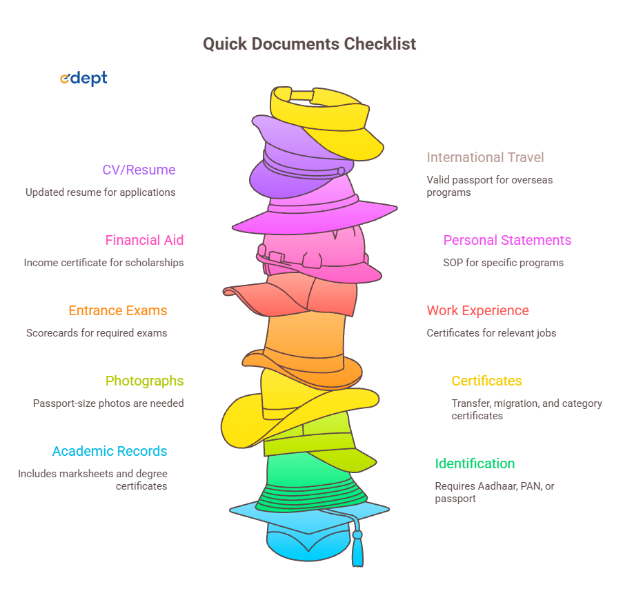 Whether you are applying for a UG course or a PG course, there are a few sets of documents that are similar for almost every institution. You can think of it as a core admission checklist or requirement.